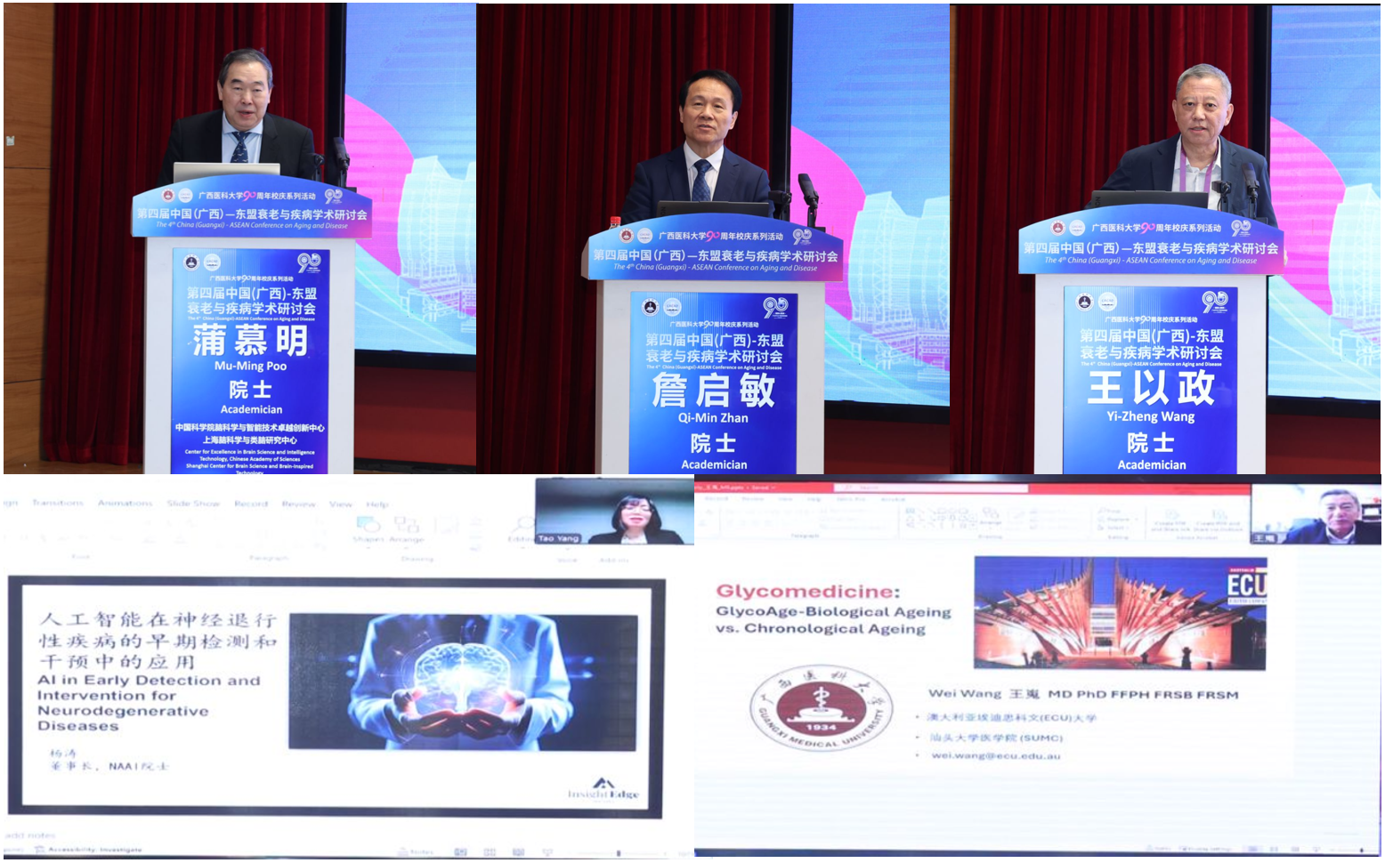 11月19日至22日,在广西医科大学90周年华诞之际,由广西医科大学主办,长寿与老年相关疾病教育部重点实验室、广西医科大学beat365手机版官网入口、广西解剖学会等单位承办的第四届中国(广西)-东盟衰老与疾病学术研讨会在我校成功举行。国际著名神经生物学家、中国科学院院士、美国国家科学院院士、中国科学院脑科学与智能技术卓越创新中心学术主任蒲慕明,中国工程院院士、北京大学原常务副校长詹启敏,中国科学院院士、复旦大学脑科学转化研究院院长王以政,美国国家人工智能科学院院士Catherine Yang,英国皇家医学院院士、澳大利亚埃迪思科文大学副校长Wei Wang等院士们为大会做主旨报告。广西医科大学党委副书记、校长曾志羽教授,北京大学詹启敏院士,泰国清迈大学Nongyao Kasatpibal教授、广西科学院元昌安院长、广西科协王鸿鹄副主席先后在开幕式上致辞。学校相关职能部门和二级学院的领导、老师,清华大学十余位师生、80多位东盟国家留学生、250多位青年学生参加了会议。学校党委常委、副校长卢德成主持开幕式。